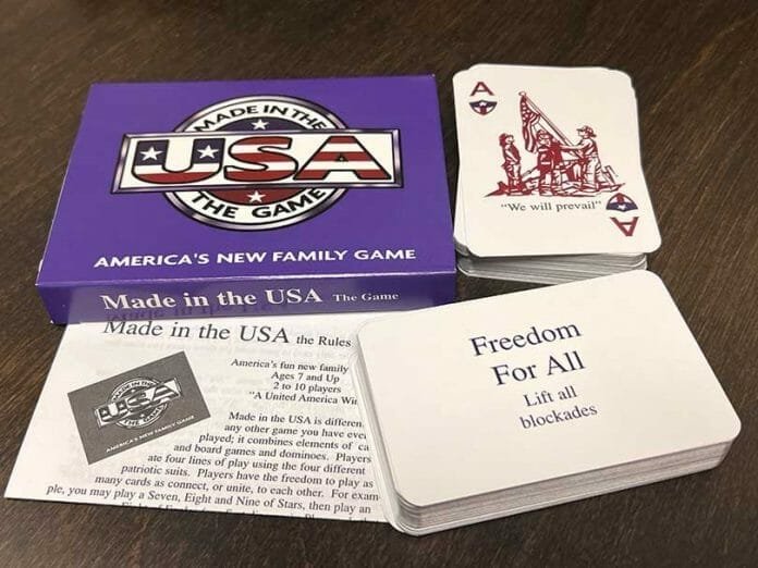 MADE IN THE USA consists of two decks of cards. One deck is a fairly standard deck, just with different suits as outlined above. With that deck players can play any card game with a patriotic twist – instead of “Hearts” they play “Eagles,” “All-American Gin” and even “Patriotic Poker.” Add the second deck of cards that have “Event” and “Changes in the Wind” cards and players can play MADE IN THE USA, that unites America by connecting all the cards and suits together, is laid out like dominoes and honors first responders, vets, those in the military and those love this country.