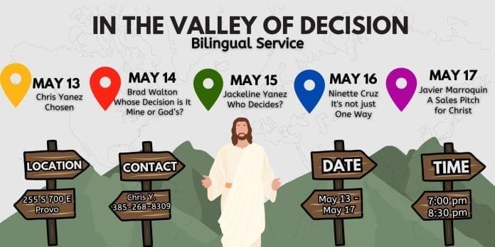 The Provo Seventh-day Adventist Church is cordially inviting all of our Provo community to a week of evangelism. Our theme for the week is “In The Valley of Decision.” We will have multiple speakers, praise and worship music, gifts, special prayers, and on Friday night snacks. Therefore, save the dates, it will all begin May 13th to the 17th, at the Provo church located at 255 S 700 E St, Provo, UT 84606. From 7:00 pm to 8:30 pm every night. The entire program will be bilingual. There will be a professional translator.