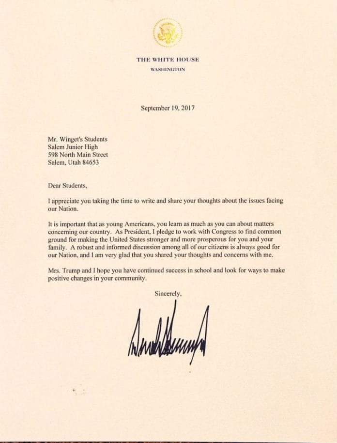 In early October Mr. Winget received a large envelop marked “Do Not Bend.” What is this about he wondered. The upper left corner of the envelope indicated it was from The White House, Washington DC. Inside was a letter with the embossed emblem of The White House at the top. The letter was addressed to Mr. Winget’s Students and signed by Donald Trump. The President of the United States actually responded to the students of Salem Junior High. In the President’s letter, he said, “A robust and informed discussion among all of our citizens is always good for our Nation and I am very glad you shared your thoughts and concerns with me.”