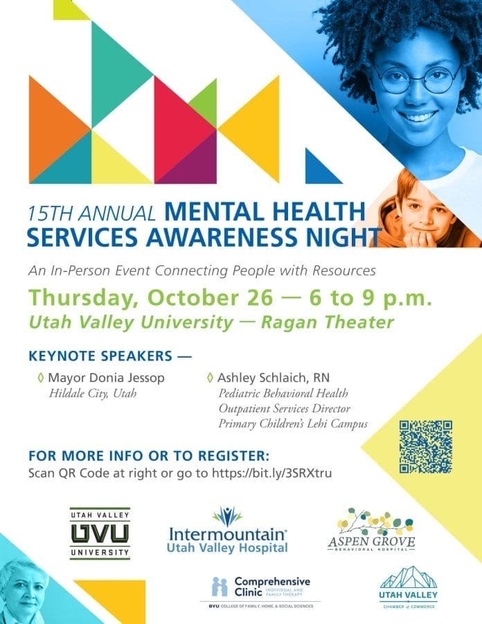 The Keynote speaker is Donia Jessop, mayor of Hildale City, Utah, who will discuss personal challenges she faced and how vital resources were to support her in her transition from an oppressive community to become the first non-FLDS endorsed as well as female mayor. Ashley Schlaich, RN, pediatric behavioral health outpatient services director for the soon to open Intermountain Primary Children’s Hospital campus in Lehi, will be another keynote speaker. She’ll discuss the new resources that will be coming early next year with the opening of the new facility and the many mental health services that the new hospital will bring to families and children in Utah County. Community partners for the event include Intermountain Health, the Utah Valley Chamber of Commerce, Utah Valley University, Aspen Grove Behavioral Hospital, and the Comprehensive Clinic at Brigham Young University.