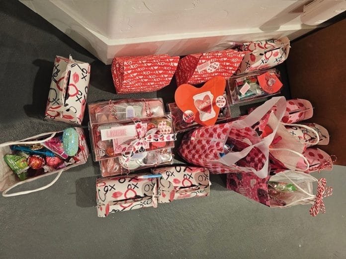 A local builder and businessman Josh Pettit and his wife Jodi Pettit donated some heart stones with little cards. Emily Magill and Ashley Siepert of Intercap Lending donated the venue to assemble, as well as candy, fortune cookies, trinkets, small perfumes, bubbles, boxes and bags. Jenifer North, owner of Maximalist Hippie Boutique donated loads of jewelry and sweet accessories. Audree Flanders of Save the Day Seasonings donated cute card cut-outs with chocolate kisses on them.