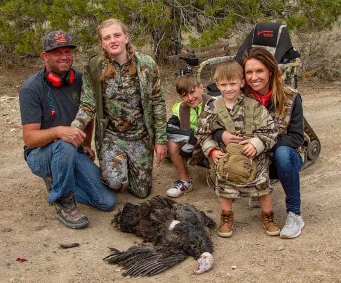 The hunt began with a safety briefing and action plan by the ranch owner, Kelly Prestwich. The turkey hunts were carried out separately with Taige getting her bird first. Spencer, who had five shots in his shotgun, blasted away at a tree a turkey was hiding behind, bringing down several branches before the turkey was brought down.